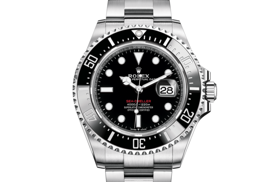 The 60-minute graduated, unidirectional rotatable bezel of the Sea-Dweller enables divers to precisely and safely monitor their dive and decompression times. It is equipped with a patented black Cerachrom bezel insert manufactured by Rolex in a virtually scratchproof ceramic whose colour is unaffected by ultraviolet rays. The graduation is coated via PVD (Physical Vapour Deposition) with a thin layer of platinum. The sleek black dial features large Chromalight hour markers and hands, filled with luminescent material that emits a long-lasting blue glow for excellent legibility in dark conditions.