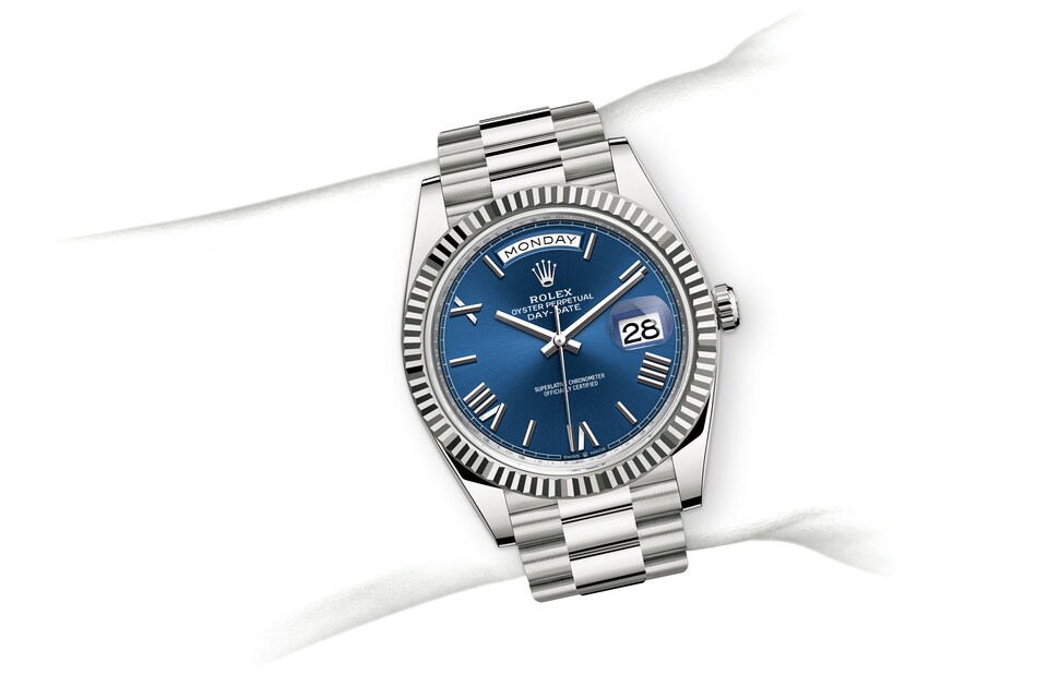 The Rolex fluted bezel is a mark of distinction. Originally, the fluting of the Oyster bezel had a functional purpose: it served to screw the bezel onto the case helping to ensure the waterproofness of the watch. It was therefore identical to the fluting on the case back, which was also screwed onto the case for waterproofness, using specific Rolex tools. Over time, the fluting became an aesthetic element, a genuine Rolex signature feature. Today the fluted bezel is a mark of distinction, in gold on this Day-Date 40.