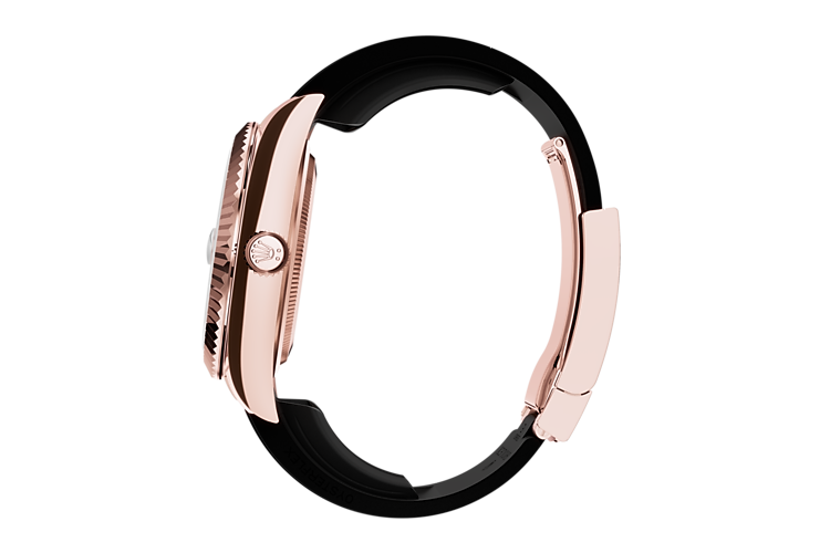 The Sky-Dweller’s new Oysterflex bracelet, developed and patented by Rolex, offers a sporty alternative to metal bracelets. The bracelet attaches to the watch case and the Oysterclasp by a flexible titanium and nickel alloy metal blade. The blade is overmoulded with high-performance black elastomer which is particularly resistant to environmental effects, very durable and perfectly inert for the wearer of the watch. For enhanced comfort, the inside of the Oysterflex bracelet is equipped with a patented longitudinal cushion system that stabilizes the watch on the wrist and fitted with an 18 ct Everose gold Oysterclasp. It also features the Rolex Glidelock extension system, designed and patented by the brand. This inventive toothed mechanism, integrated beneath the clasp, allows fine adjustment of the bracelet length by some 15 mm in increments of approximately 2.5 mm, without the use of tools.