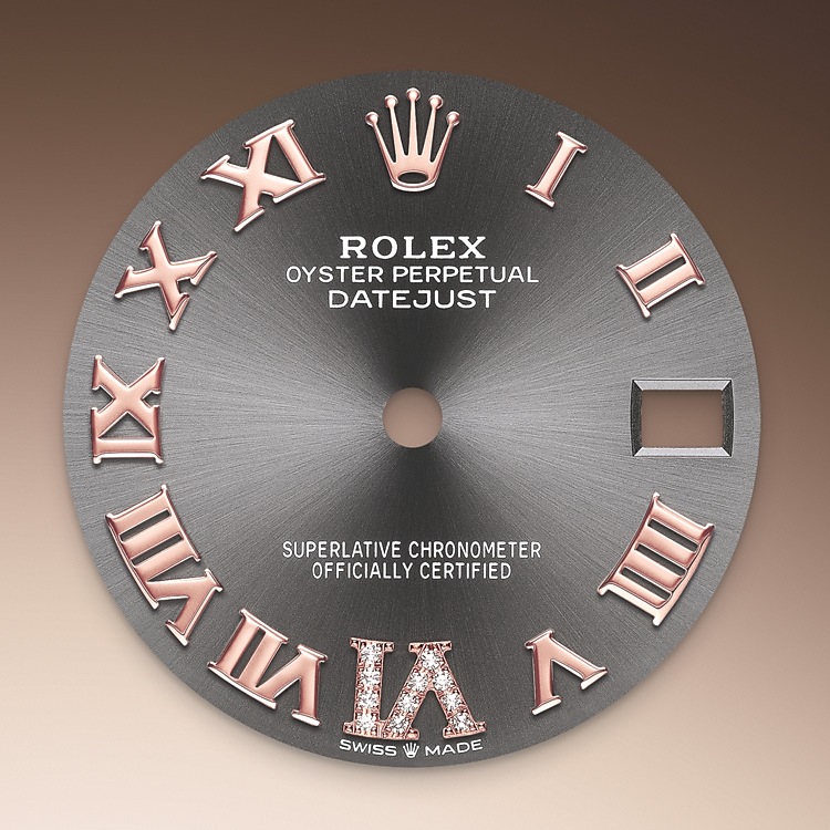 This dial features a large VI set with 11 diamonds. The sunray finish creates delicate light reflections on many dials in the Oyster Perpetual collection. It is obtained using masterful brushing techniques that create grooves running outwards from the centre of the dial. Light is diffused consistently along each engraving, creating a characteristic subtle glow that moves depending on the position of the wrist. Once the sunray finish has been completed, the dial colour is applied using Physical Vapour Deposition or electroplating. A light coat of varnish gives the dial its final look.