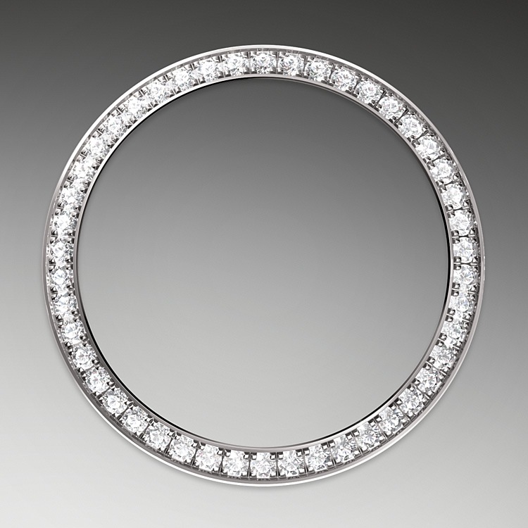 This dial features diamonds in 18 ct gold settings. The sunray finish creates delicate light reflections on many dials in the Oyster Perpetual collection. It is obtained using masterful brushing techniques that create grooves running outwards from the centre of the dial. Light is diffused consistently along each engraving, creating a characteristic subtle glow that moves depending on the position of the wrist. Once the sunray finish has been completed, the dial colour is applied using Physical Vapour Deposition or electroplating. A light coat of varnish gives the dial its final look.