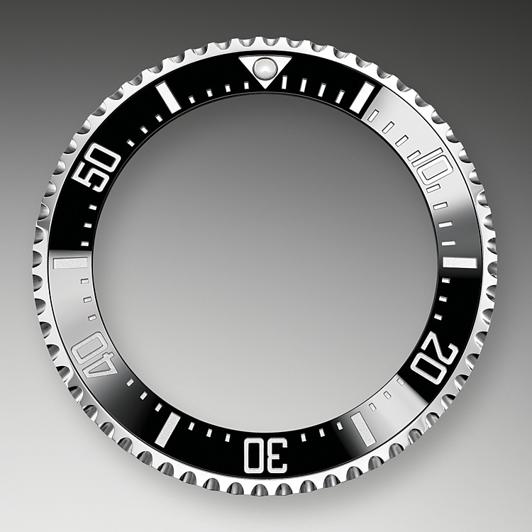 The 60-minute graduated, unidirectional rotatable bezel of the Sea-Dweller enables divers to precisely and safely monitor their dive and decompression times. It is equipped with a patented black Cerachrom bezel insert manufactured by Rolex in a virtually scratchproof ceramic whose colour is unaffected by ultraviolet rays. The graduation is coated via PVD (Physical Vapour Deposition) with a thin layer of platinum. The sleek black dial features large Chromalight hour markers and hands, filled with luminescent material that emits a long-lasting blue glow for excellent legibility in dark conditions.