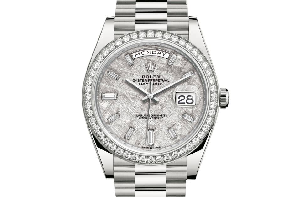 Meteorite comes from the heart of an asteroid or possibly even a planet that has exploded, propelling material across the Solar System until chance brings it into our planet’s orbit and gravity pulls it to Earth. During its journey, the centre of the meteorite is gradually transformed, producing highly unusual metallic patterns, resulting from the very slow cooling of molten asteroid cores. The designers at Rolex create from these configurations a unique treasure for some of the most prestigious models, including this Day-Date 40.
