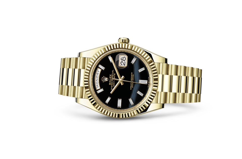 The Rolex fluted bezel is a mark of distinction. Originally, the fluting of the Oyster bezel had a functional purpose: it served to screw the bezel onto the case helping to ensure the waterproofness of the watch. It was therefore identical to the fluting on the case back, which was also screwed onto the case for waterproofness, using specific Rolex tools. Over time, the fluting became an aesthetic element, a genuine Rolex signature feature. Today the fluted bezel is a mark of distinction, in gold on this Day-Date 40.